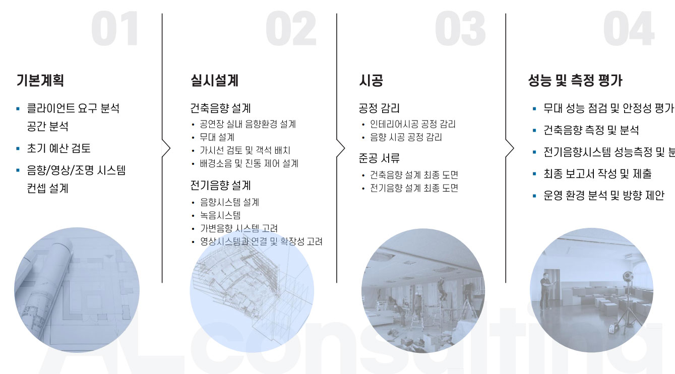 다양한 문화 예술 공간, 종교 시설, 사무 공간, 교육 시설, 상업 공간, 그리고 방송 시설용 음향 제어, 차음 설계, 명료도 확보, 프라이버시 개선을 위한 컨설팅입니다.